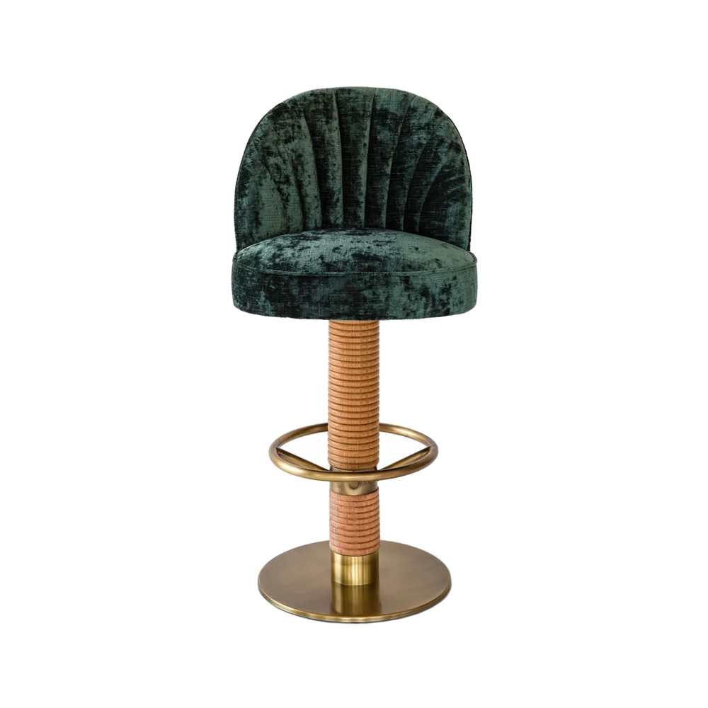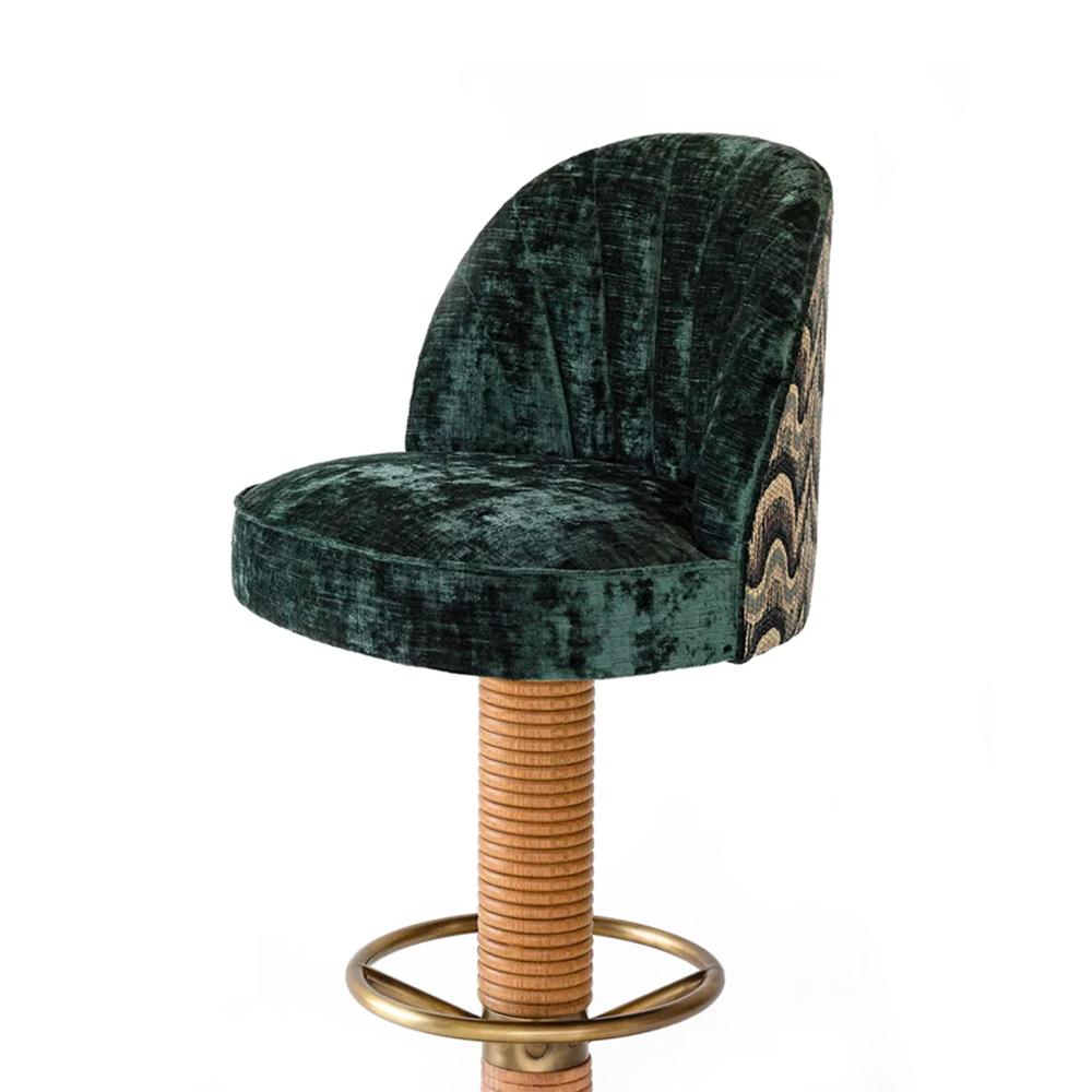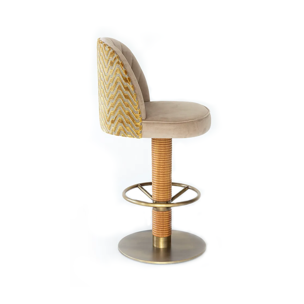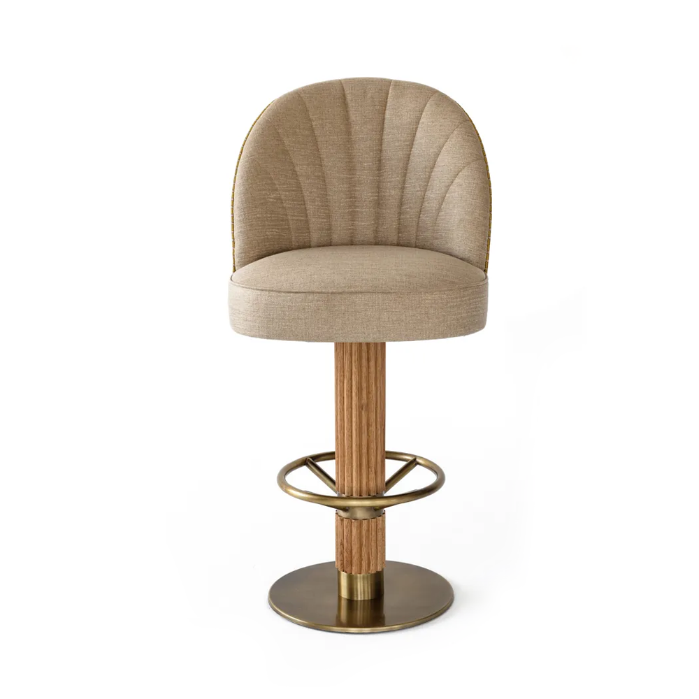 An elegant barstool with a fabric seat and brass base and foot ring and beech base.