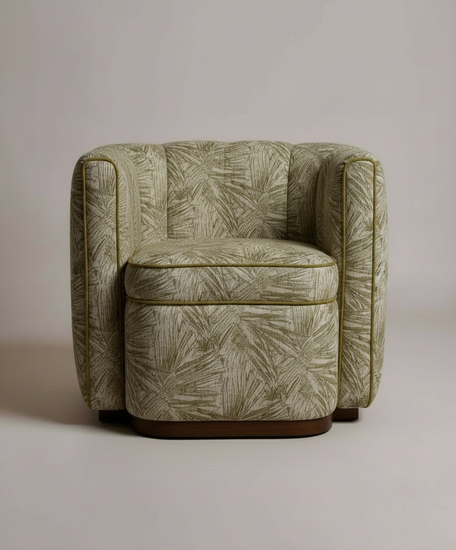 Generously padded sides and a supportive backrest form an inviting seat, while the smooth cushioned base adds softness and balance to the design. Set on a refined wooden plinth base, the armchair feels grounded, elegant, and carefully proportioned.