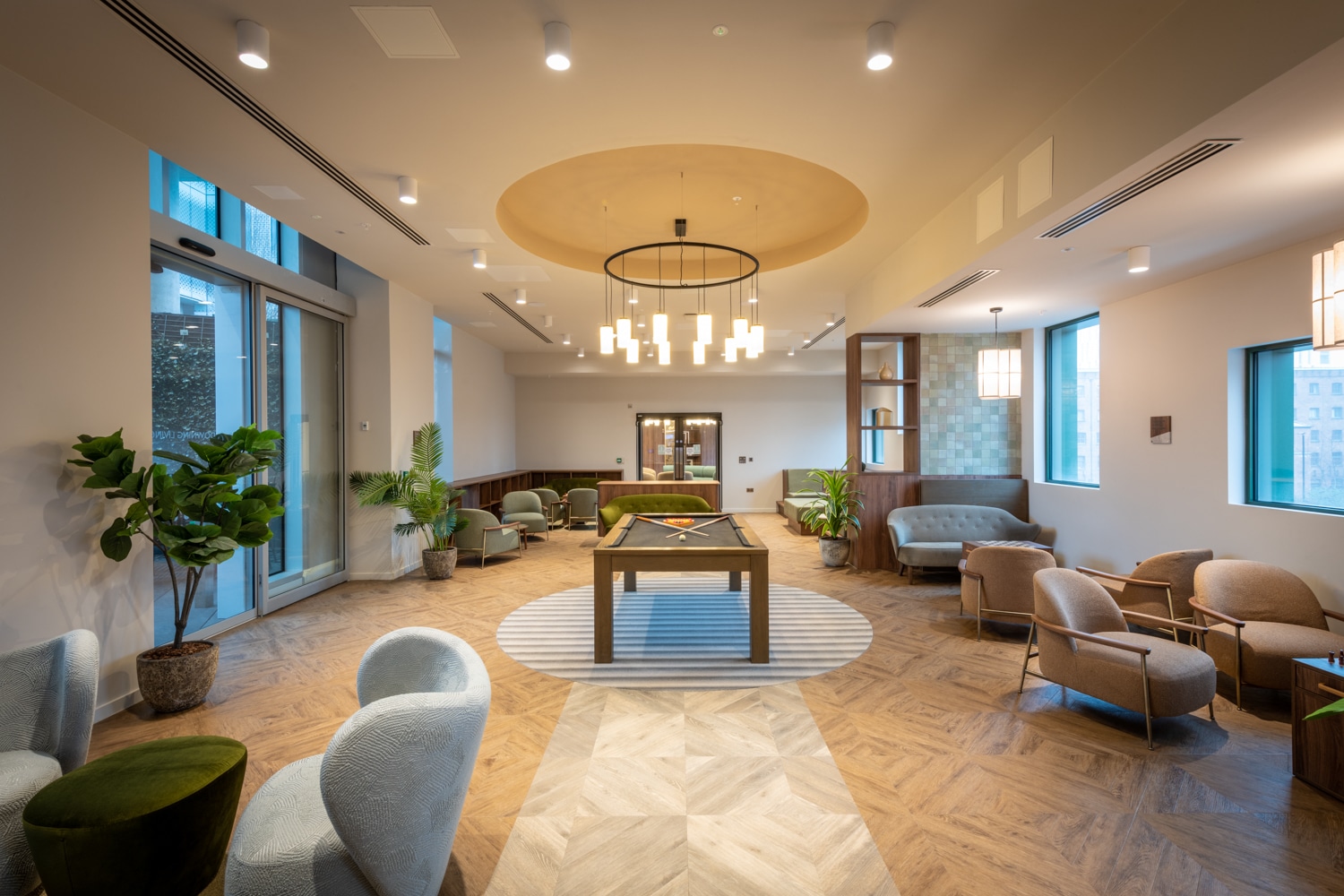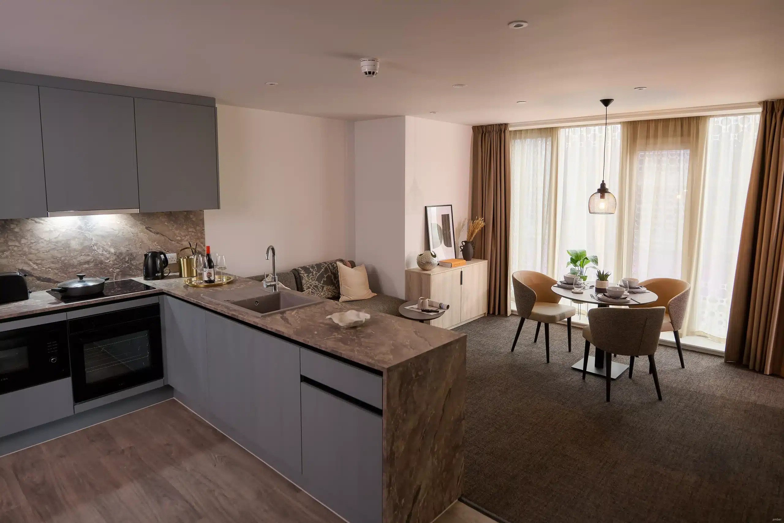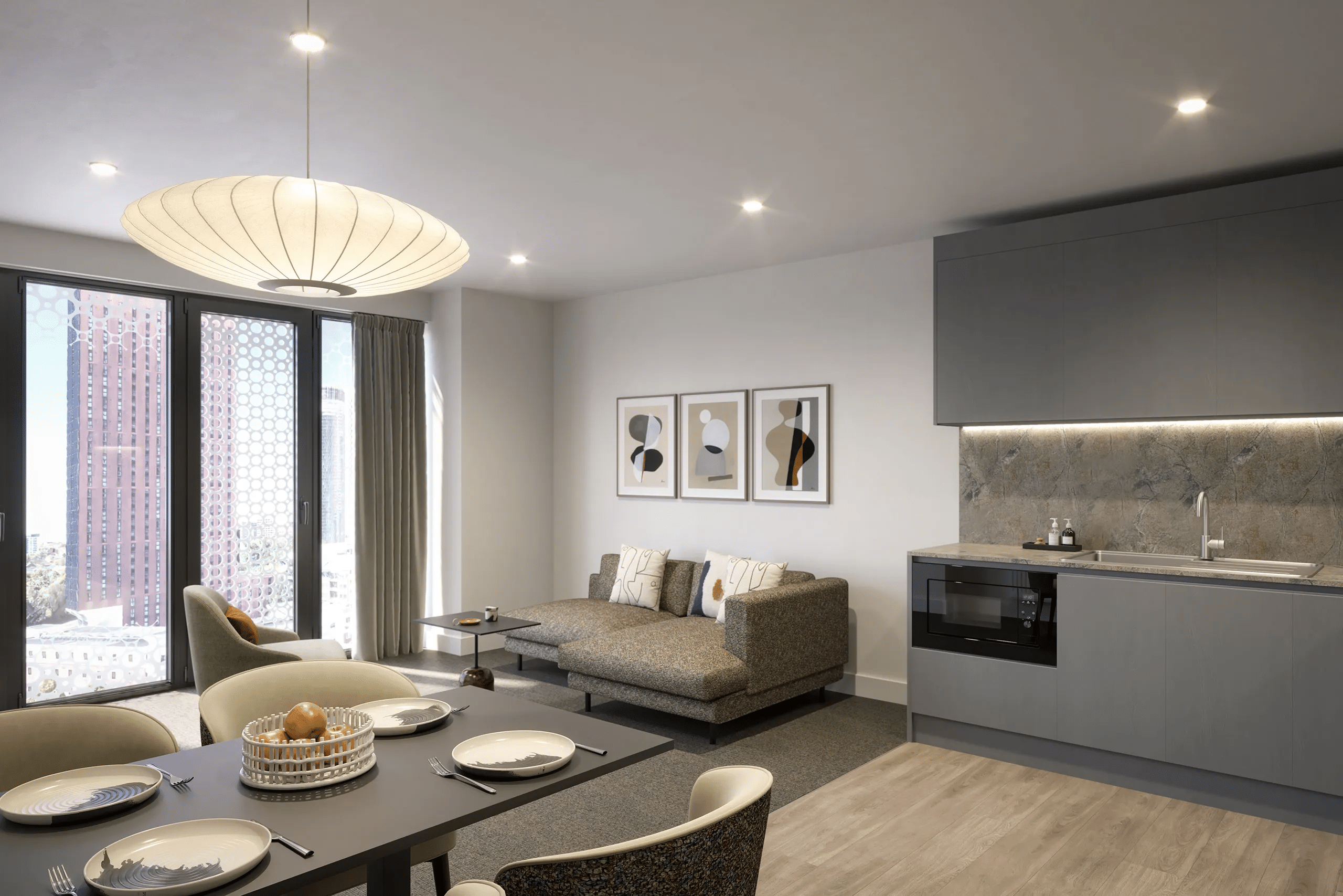 The interior design of Square Gardens emphasizes modernity and comfort. Spaces are adorned with bespoke furniture pieces that enhance the contemporary aesthetic. Features include integrated appliances, comfortable living areas, and floor-to-ceiling windows offering expansive views of Manchester.